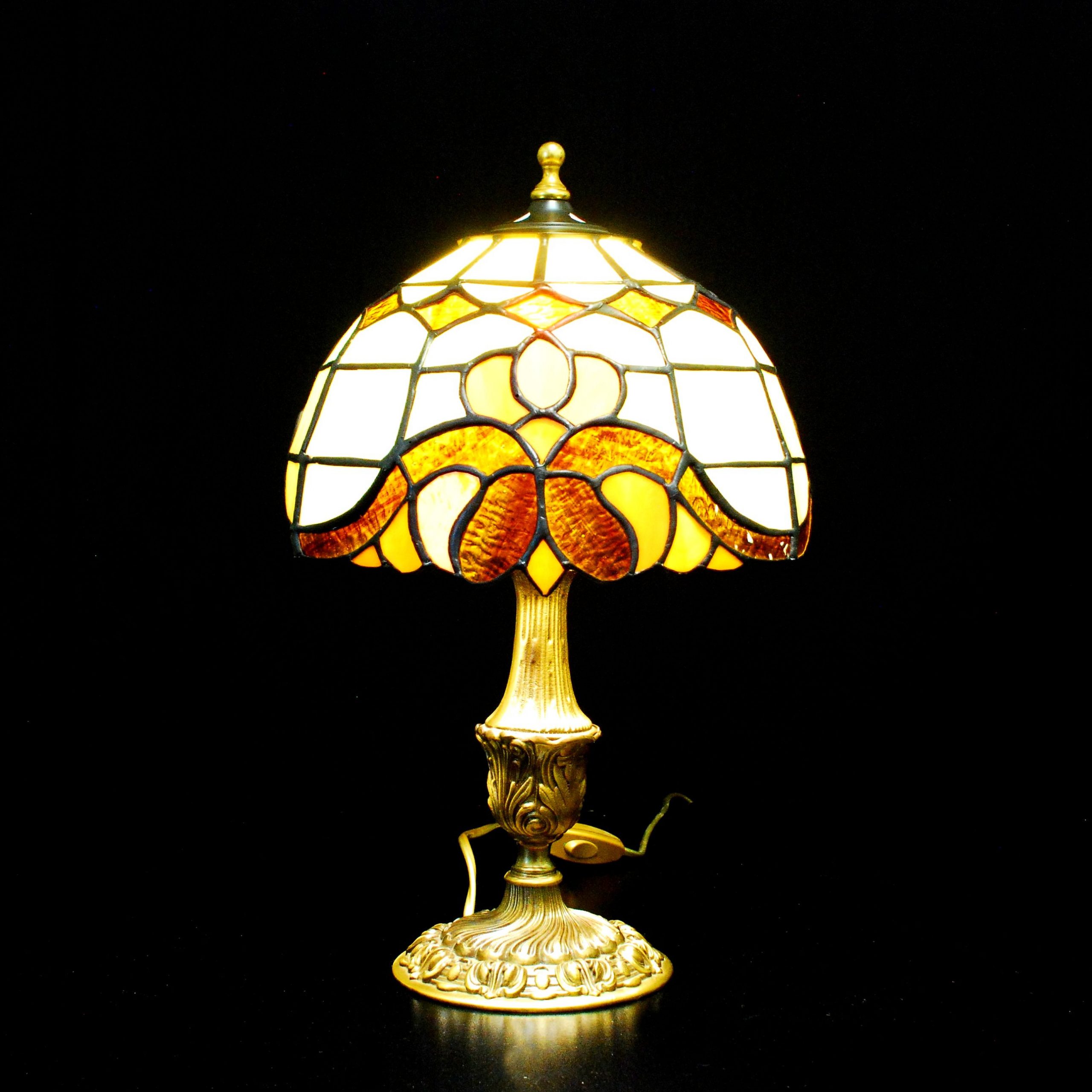 Lampada da tavolo composta di statuina in fusione di bronzo e paralume tiffany