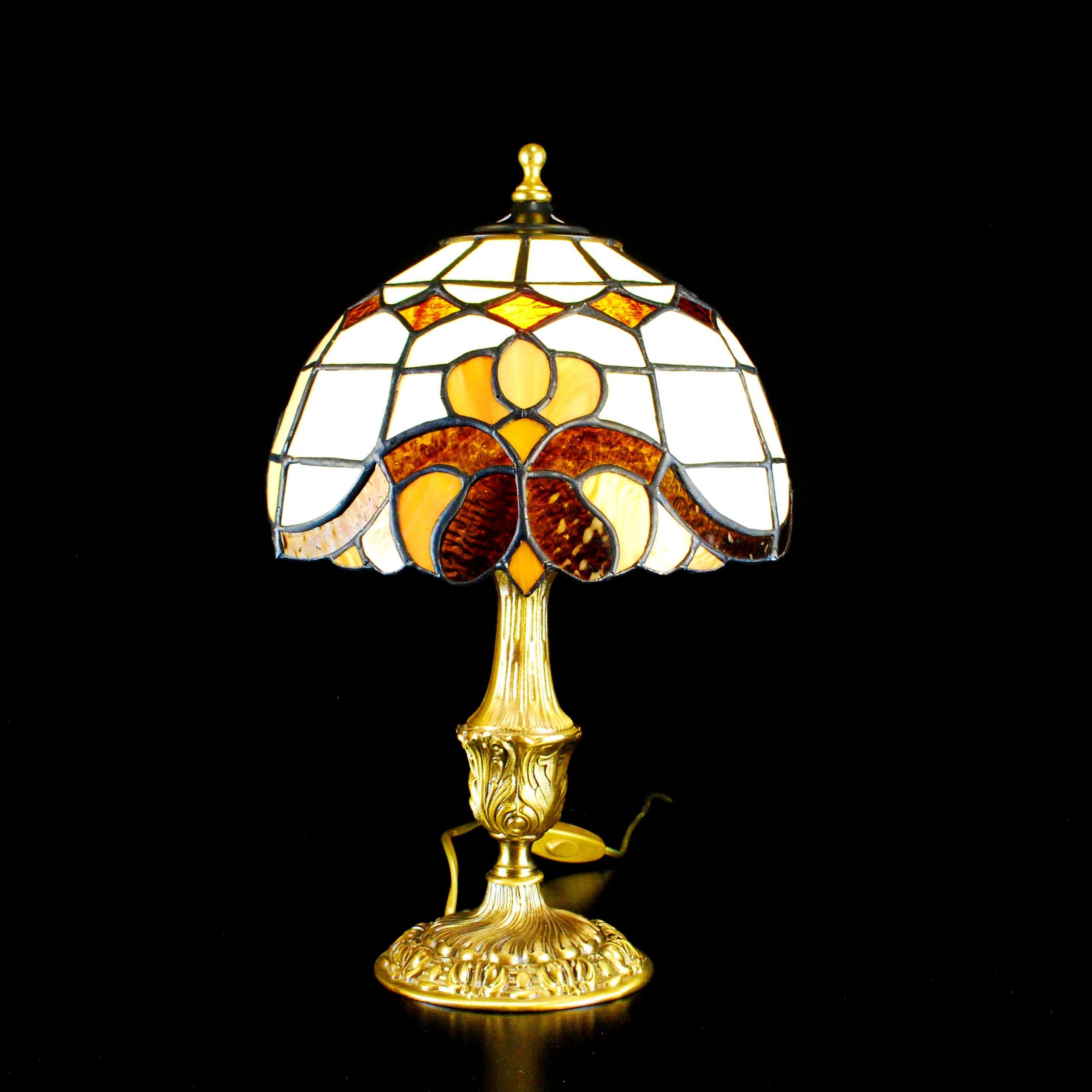 Nel solco dello stile liberty , questa graziosa lampada è una piccola opera d’arte che unisce la modellazione nella realizzazione della base in bronzo fuso e il mosaico del vetro saldato per il paralume.
