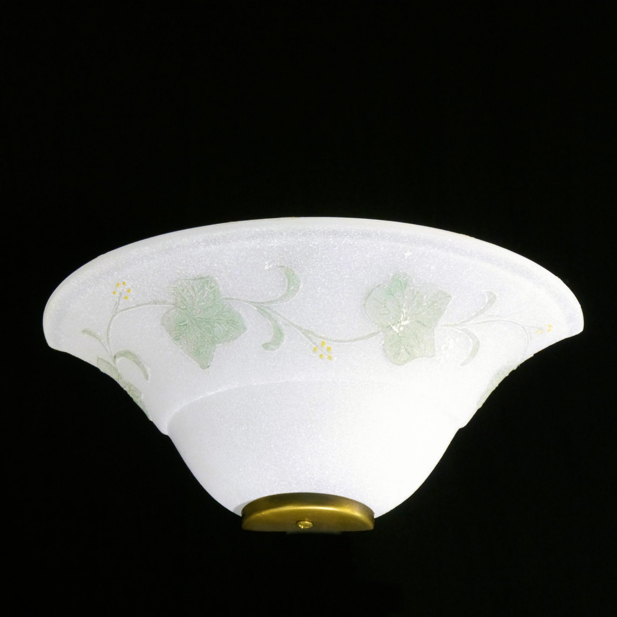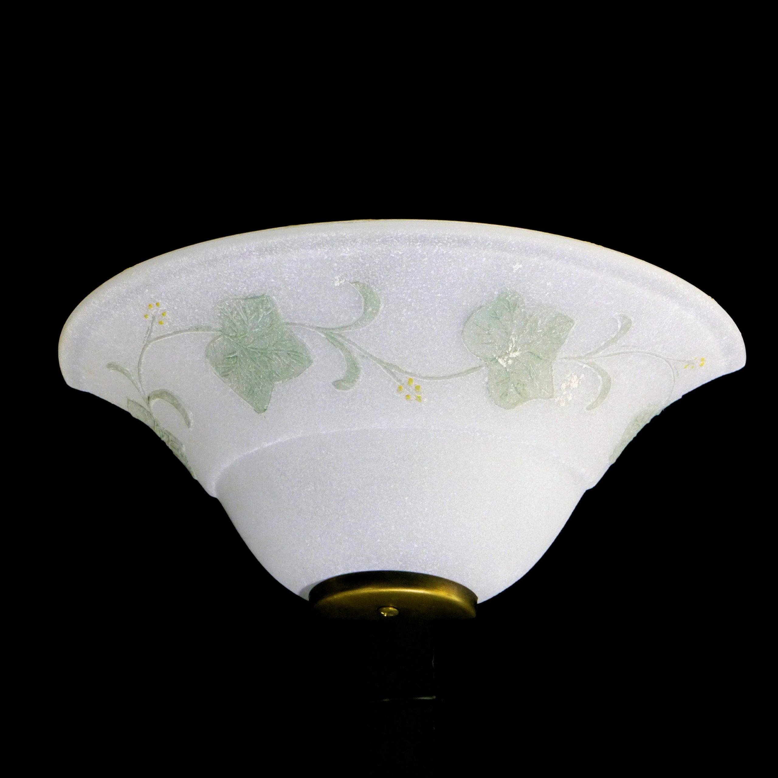 Applique con diffusore di vetro satinato con finitura scavo, impreziosito da un elegante decoro con foglie di edera color verde salvia