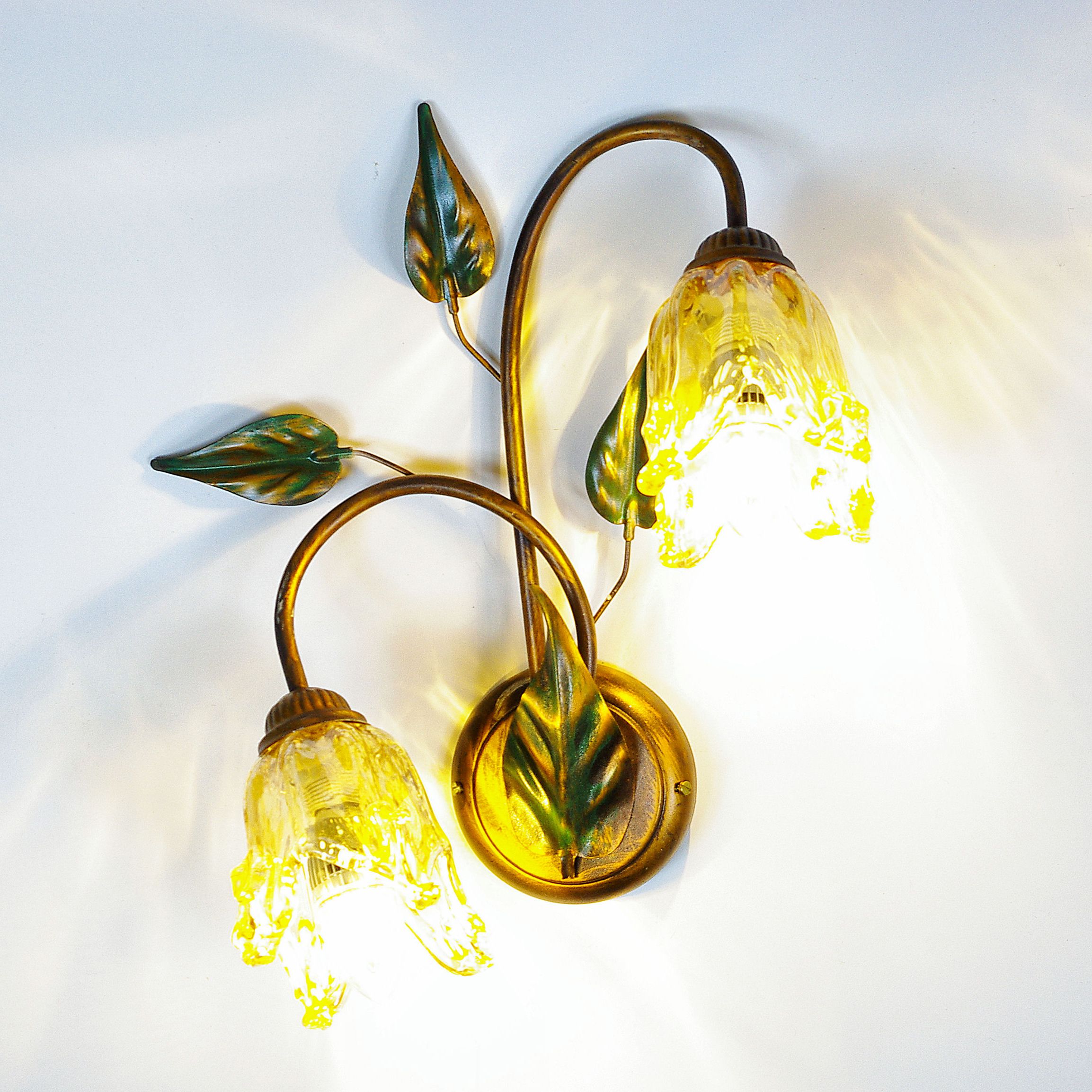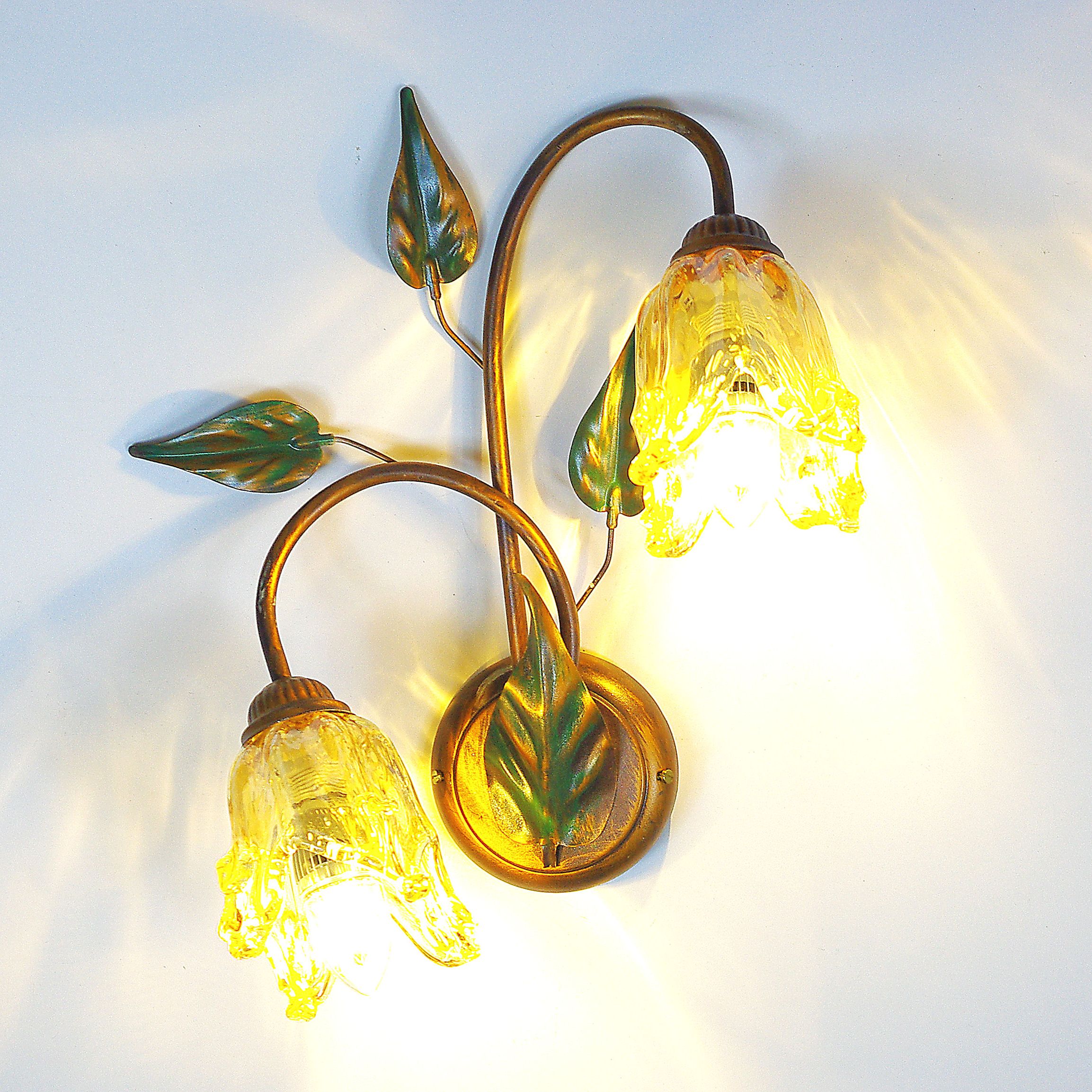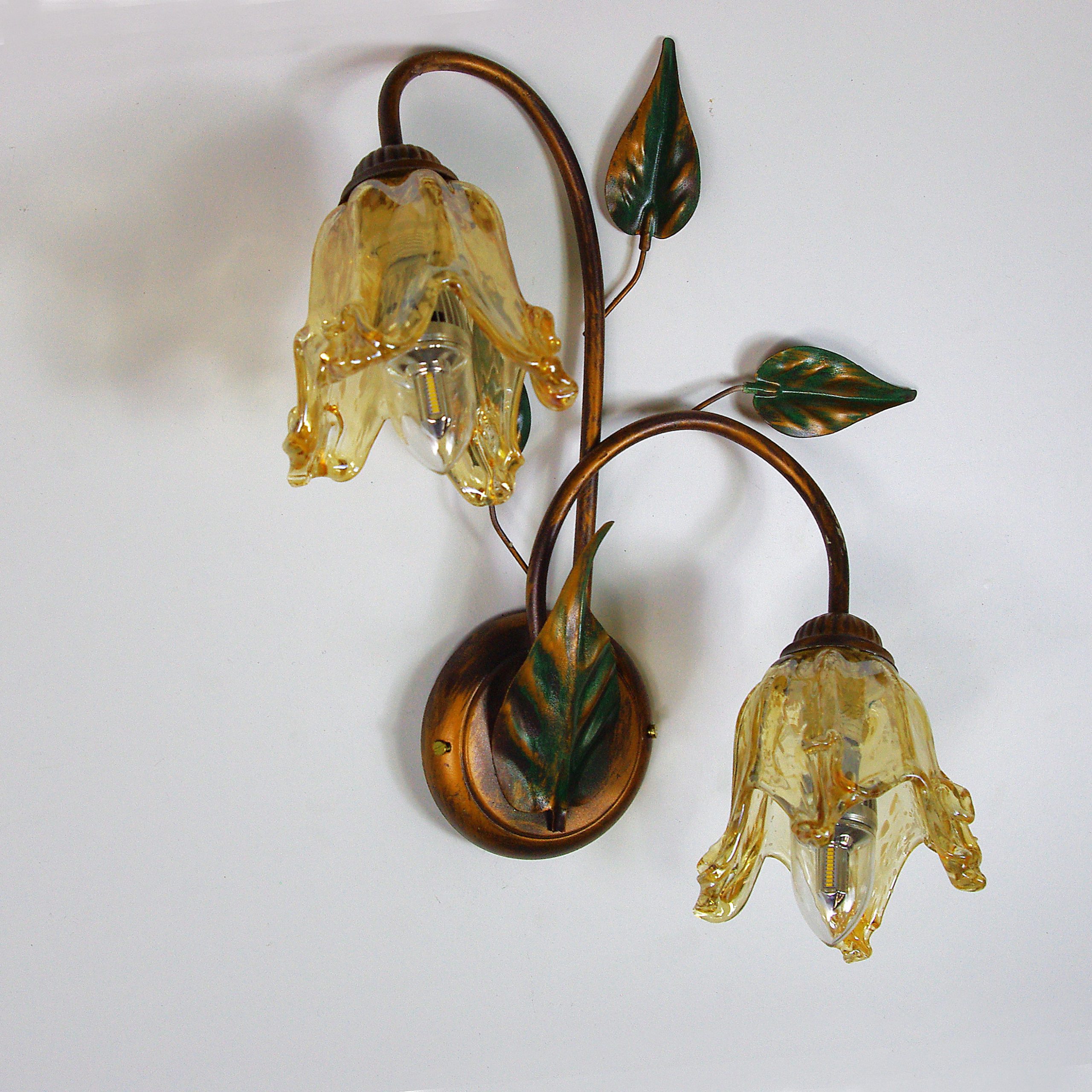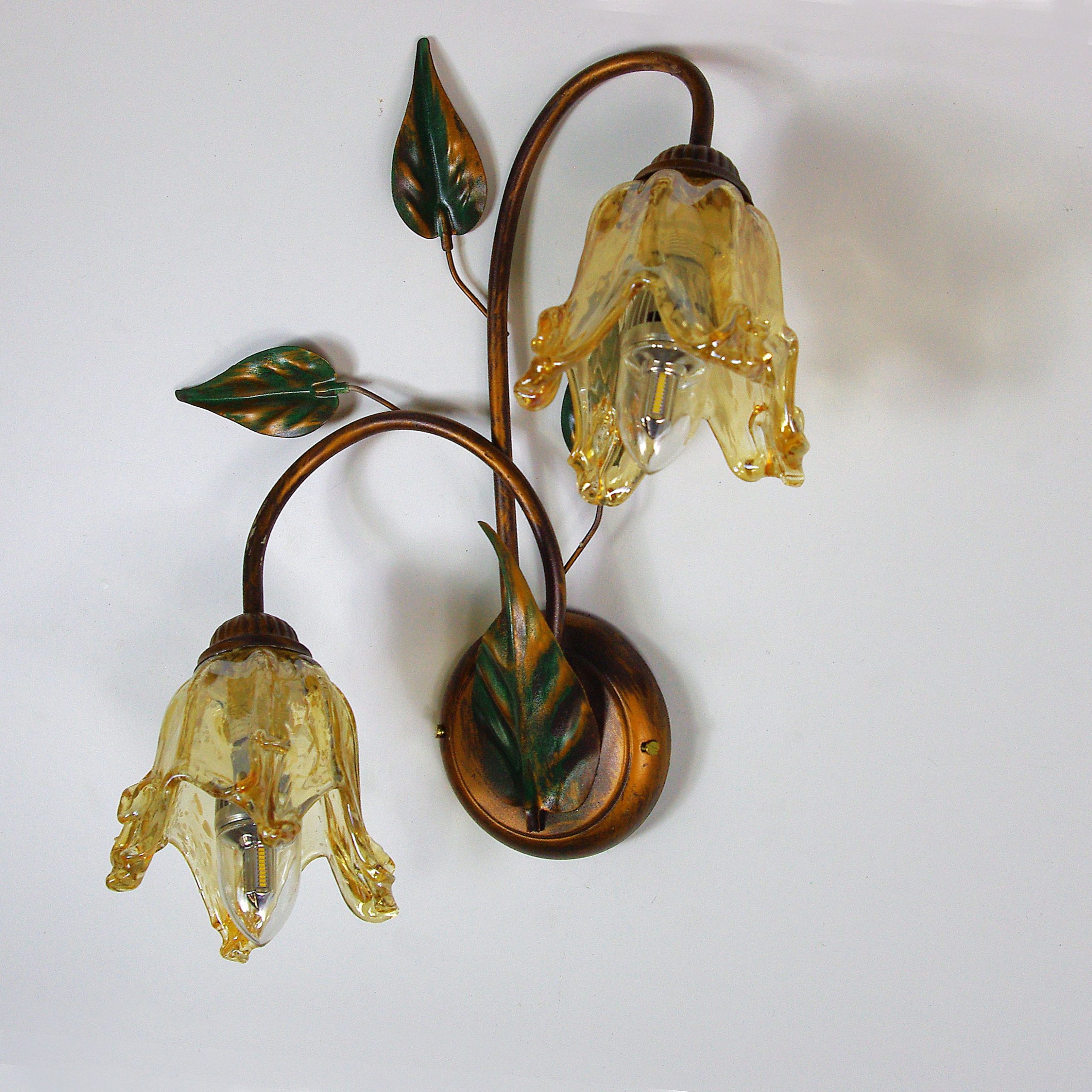 Applique o lampada da paretein stile floreale, realizzata in ferro battutoantichizzato e diffusori in vetro ambra.
