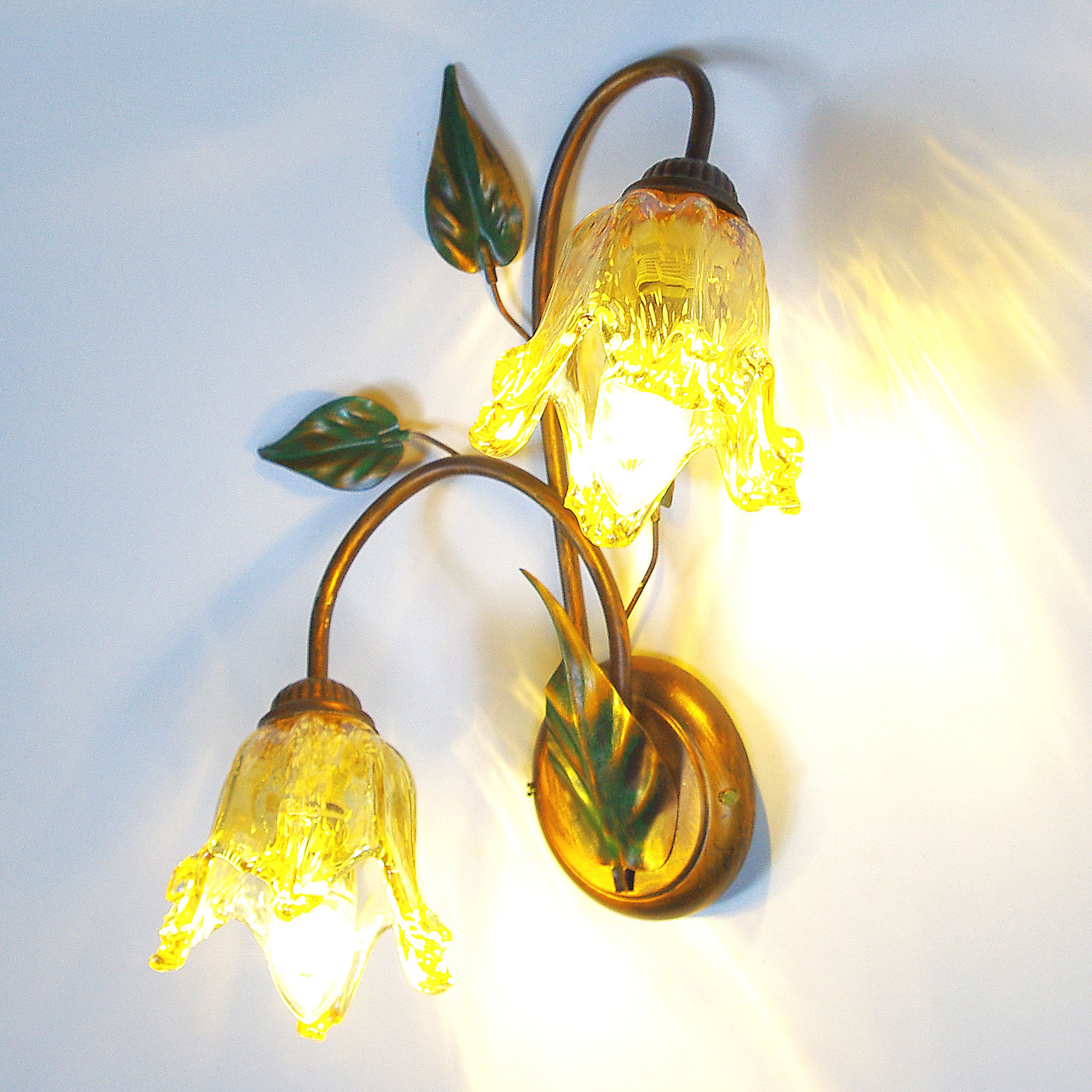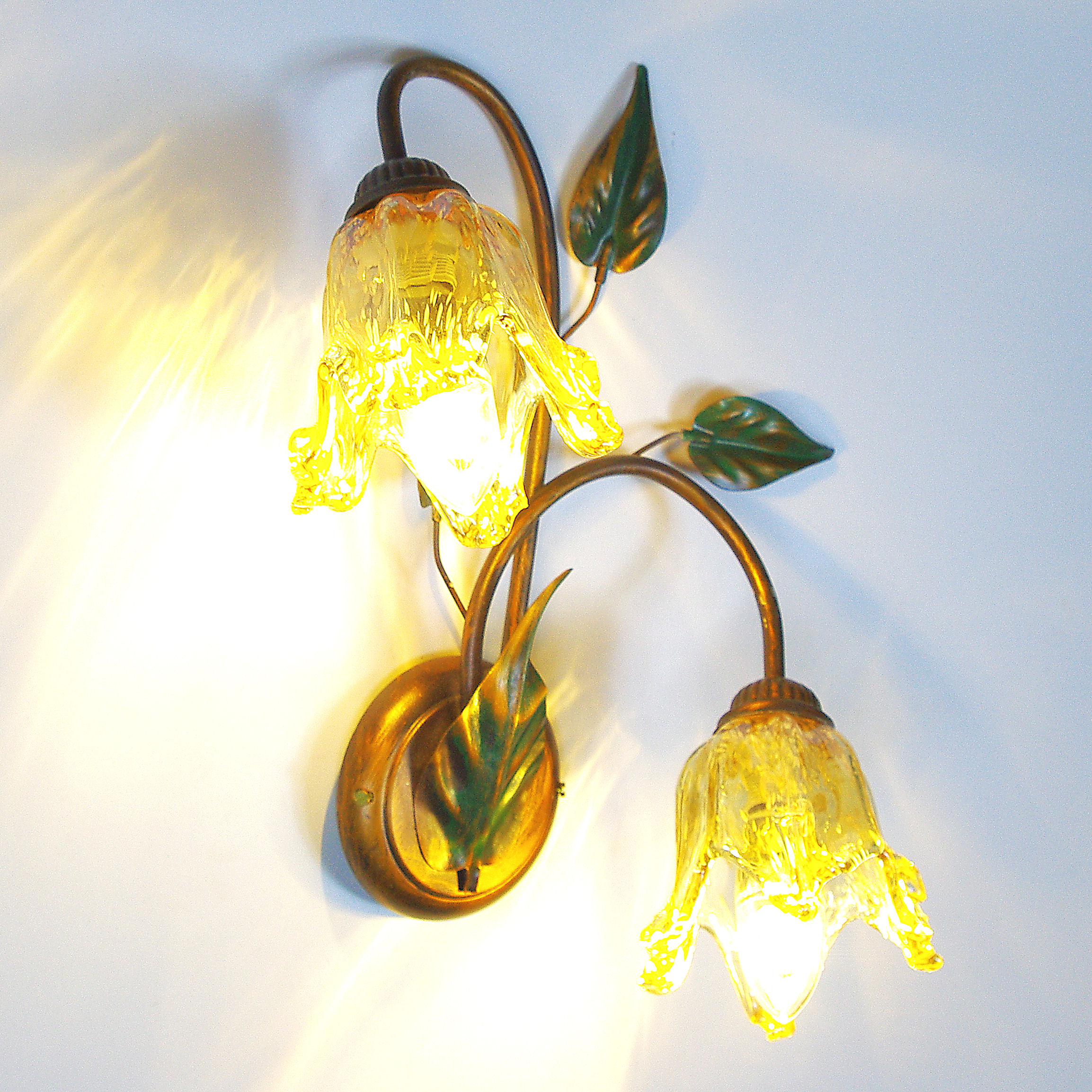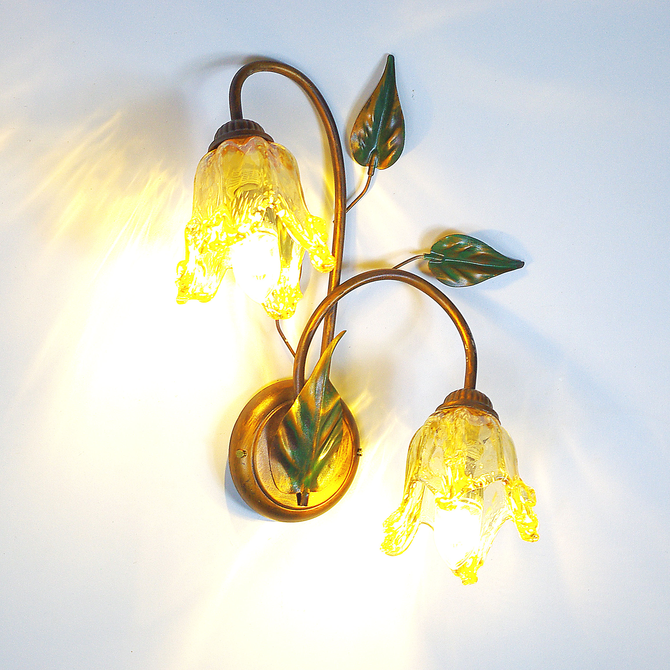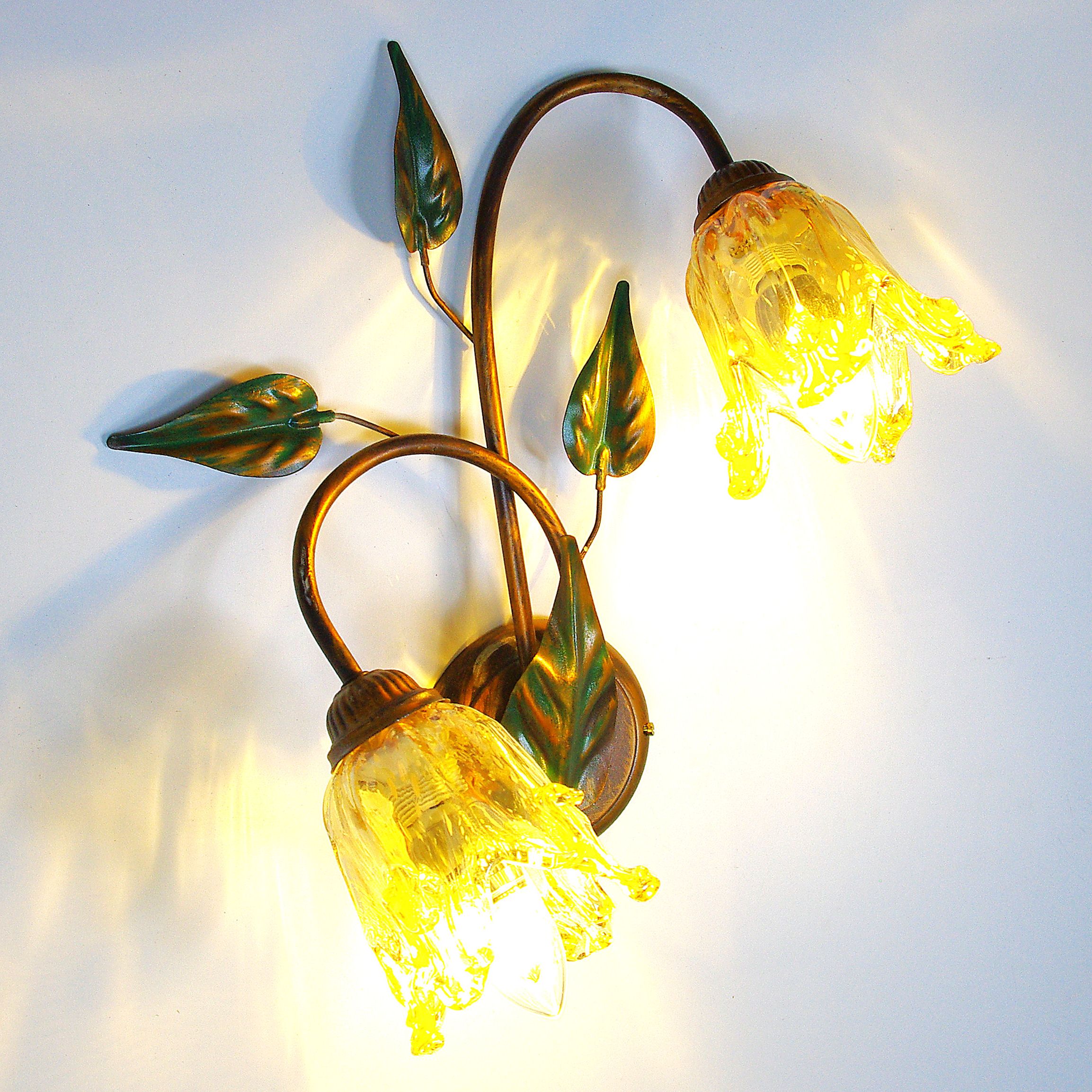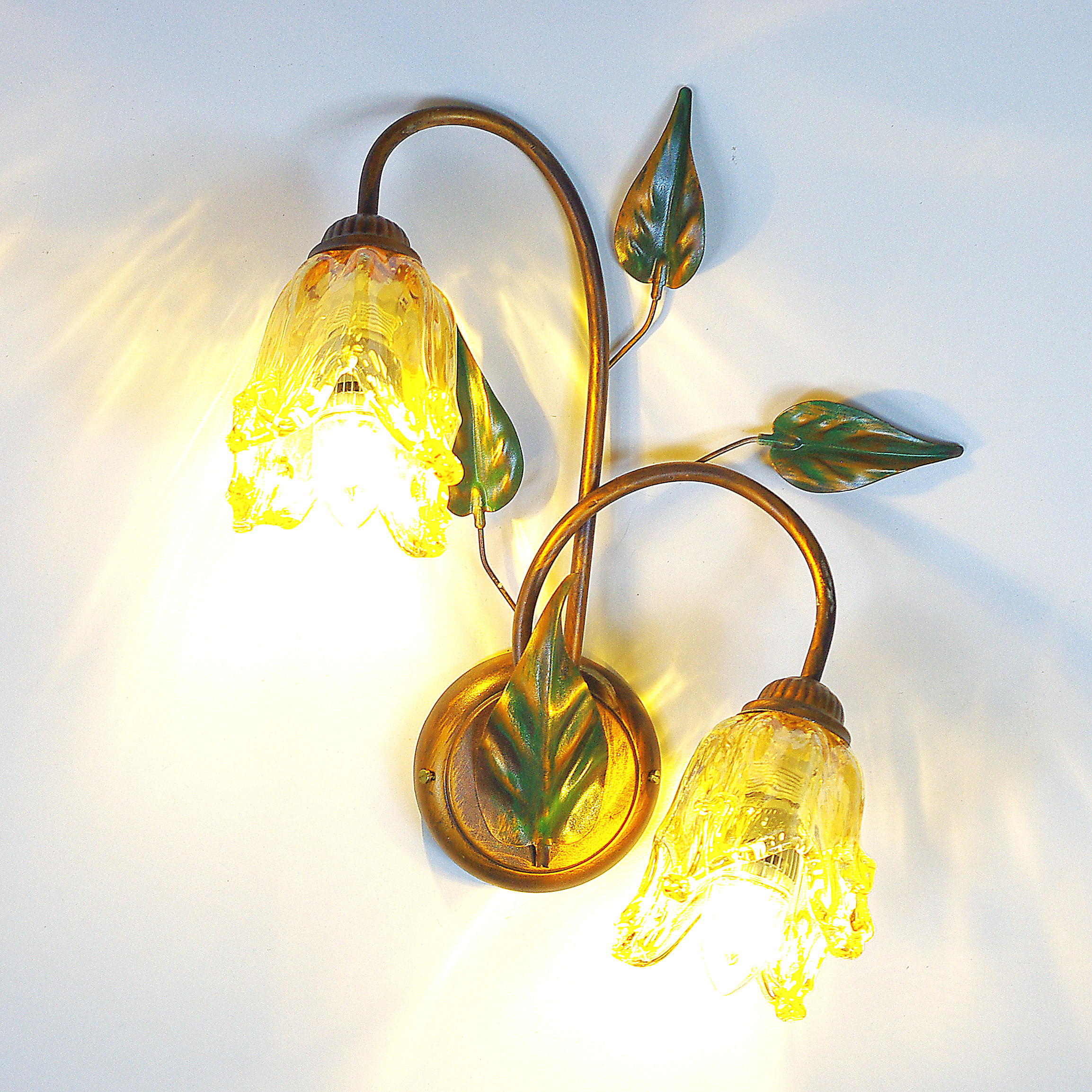 Applique o lampada da paretein stile floreale, realizzata in ferro battutoantichizzato e diffusori in vetro ambra.