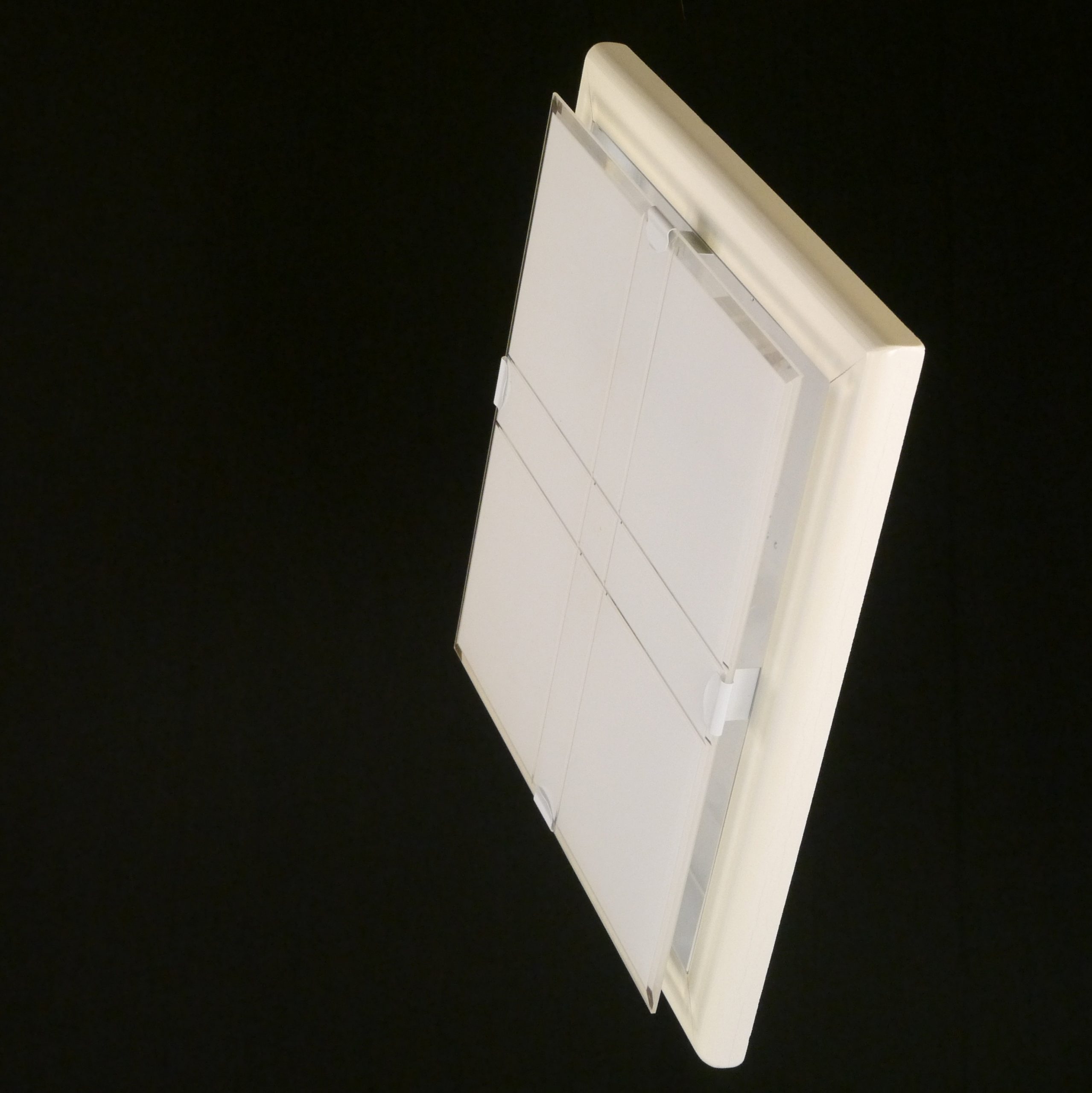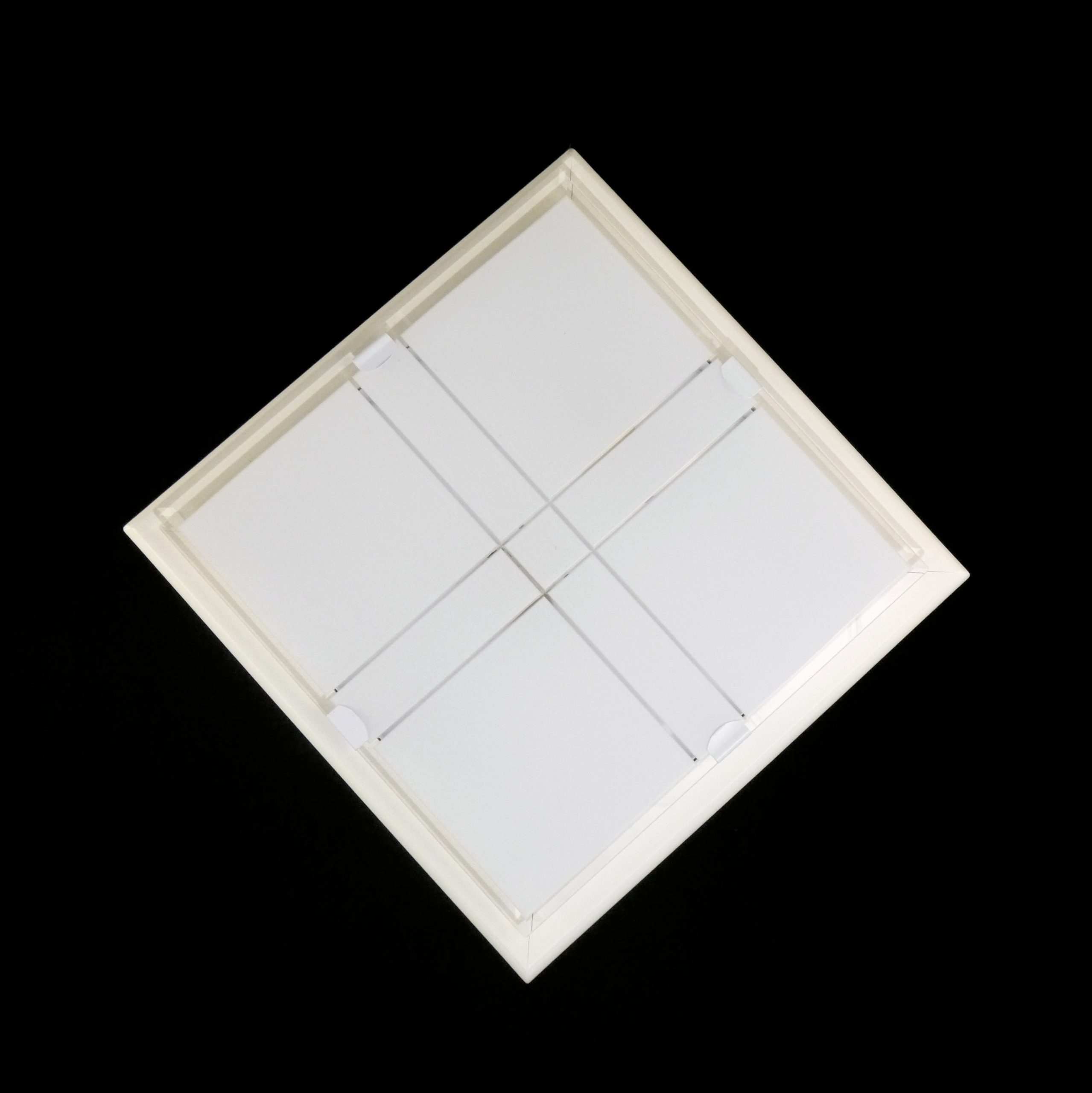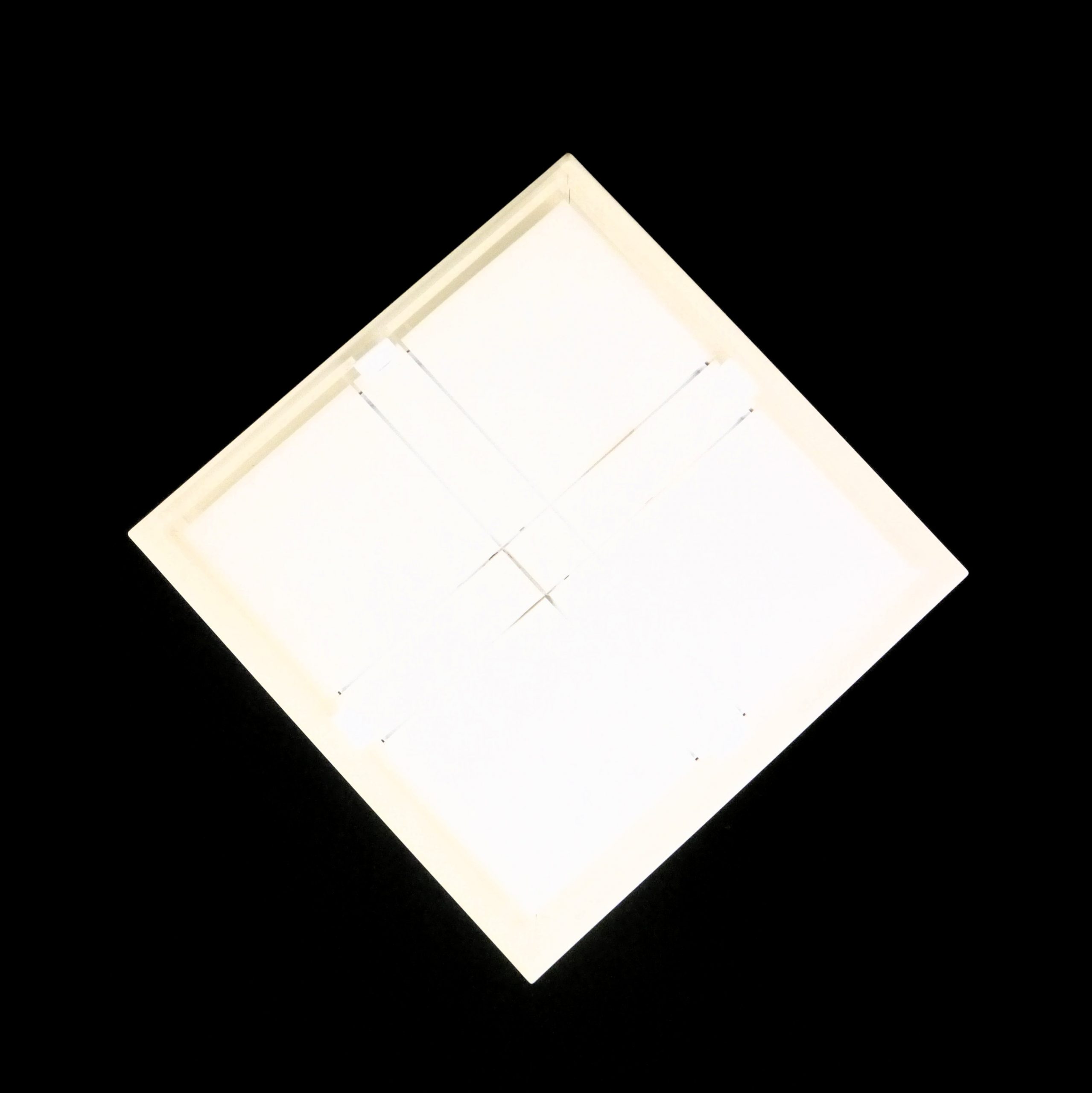 Plafoniera quadrata o romboidale con diffusore di vetro opalino e molato con finitura lucida e cornice bianco opaco.